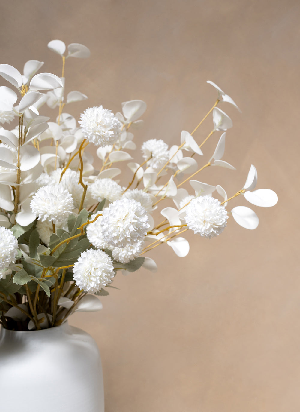 Dit samengesteld boeket omvat een mix van onze Kiku bloemen en onze Eucalyptus voor een verbluffend effect. Dit bruidsachtig boeket voegt een luxueuze uitstraling toe een elk interieur!