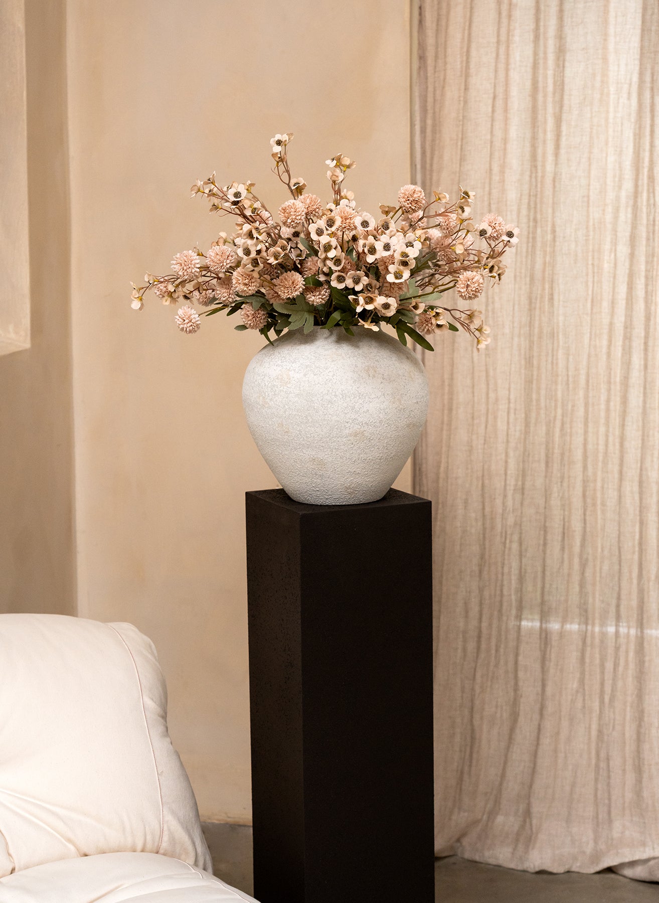 Ons nieuwe Wax arrangement is een speels en stijlvol boeket dat zorgt voor een frisse en verfijnde uitstraling in huis. De combinatie van 10 stengels zijden wax bloemen en 10 stengels kiku bloemen brengt volume, kleur en een natuurlijk gevoel samen in één harmonieus geheel.