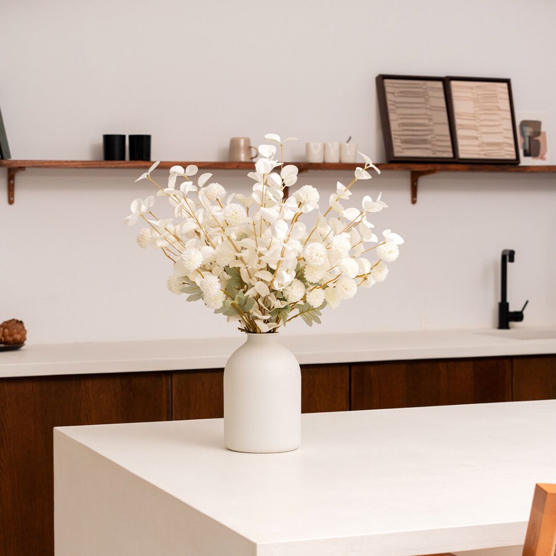 Dit samengesteld boeket omvat een mix van onze Kiku bloemen en onze Eucalyptus voor een verbluffend effect. Dit bruidsachtig boeket voegt een luxueuze uitstraling toe een elk interieur!