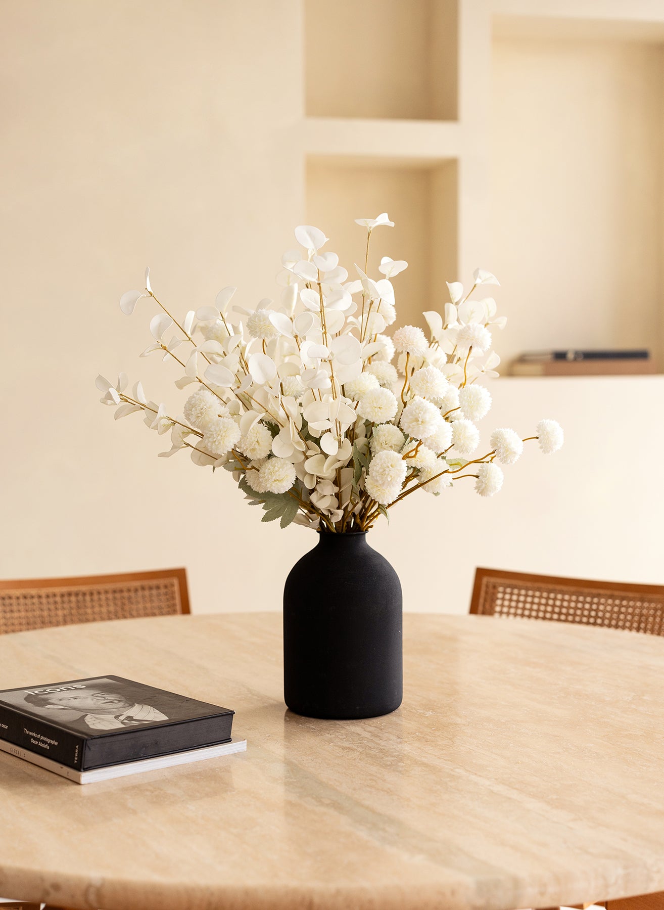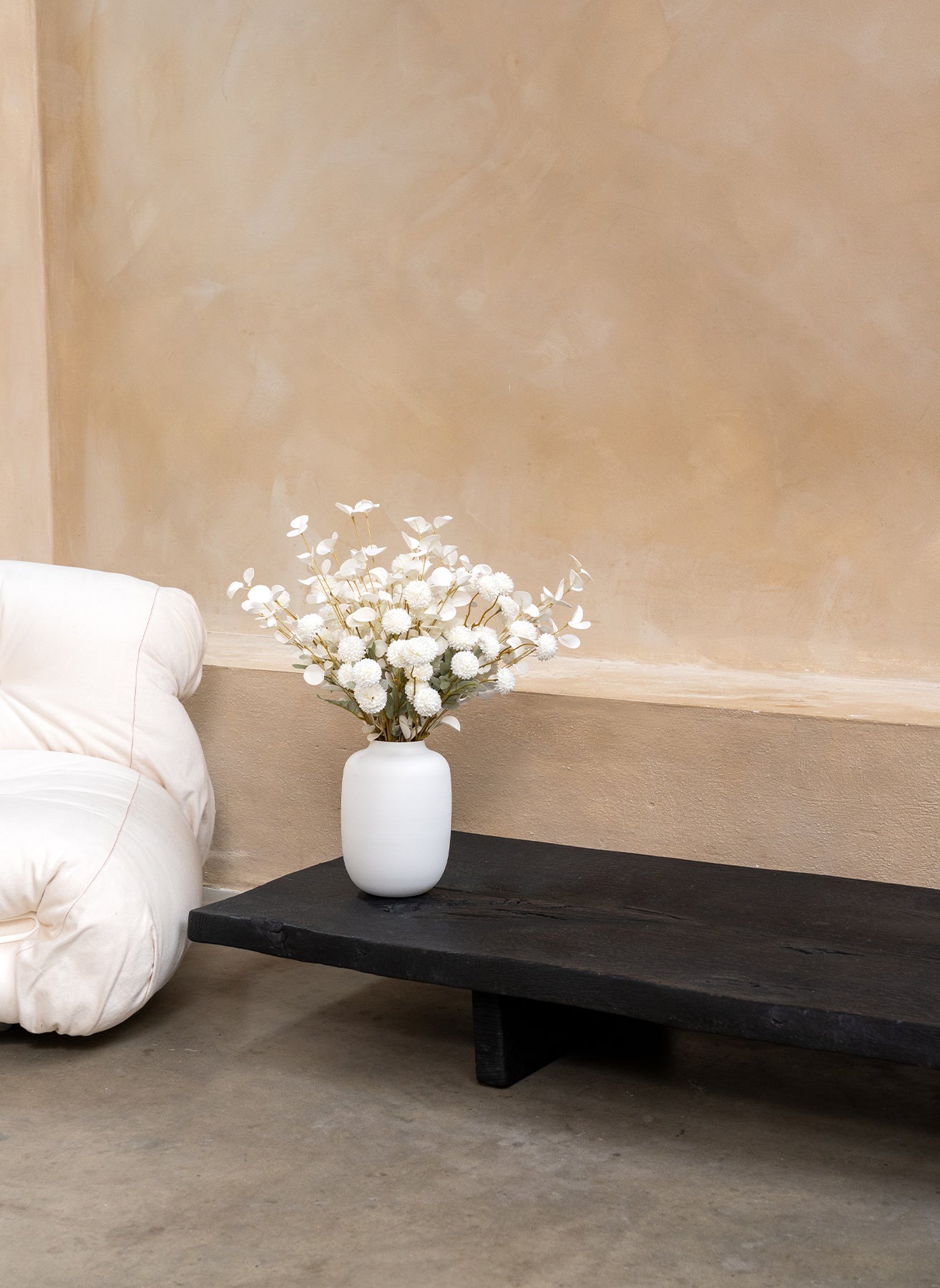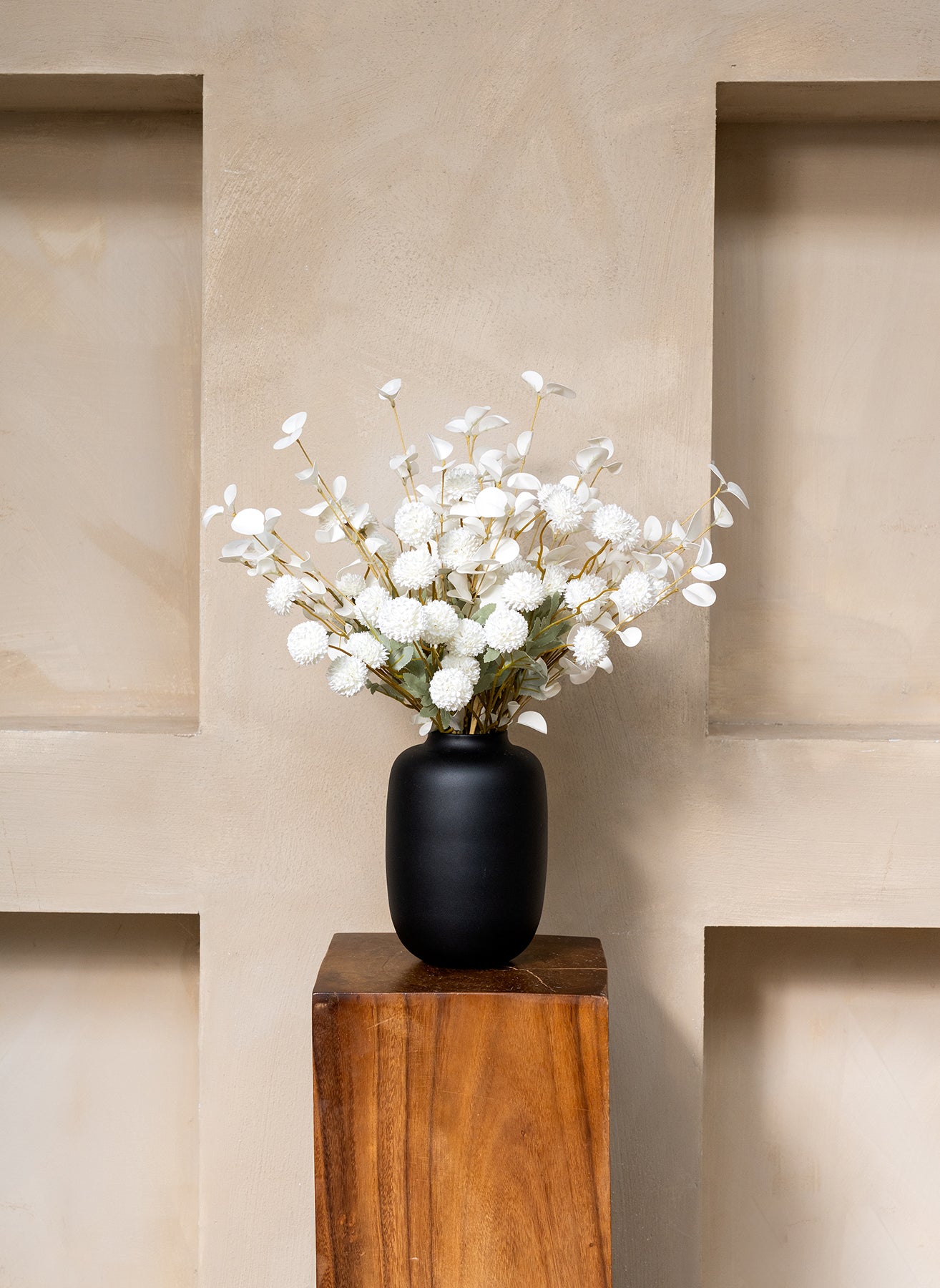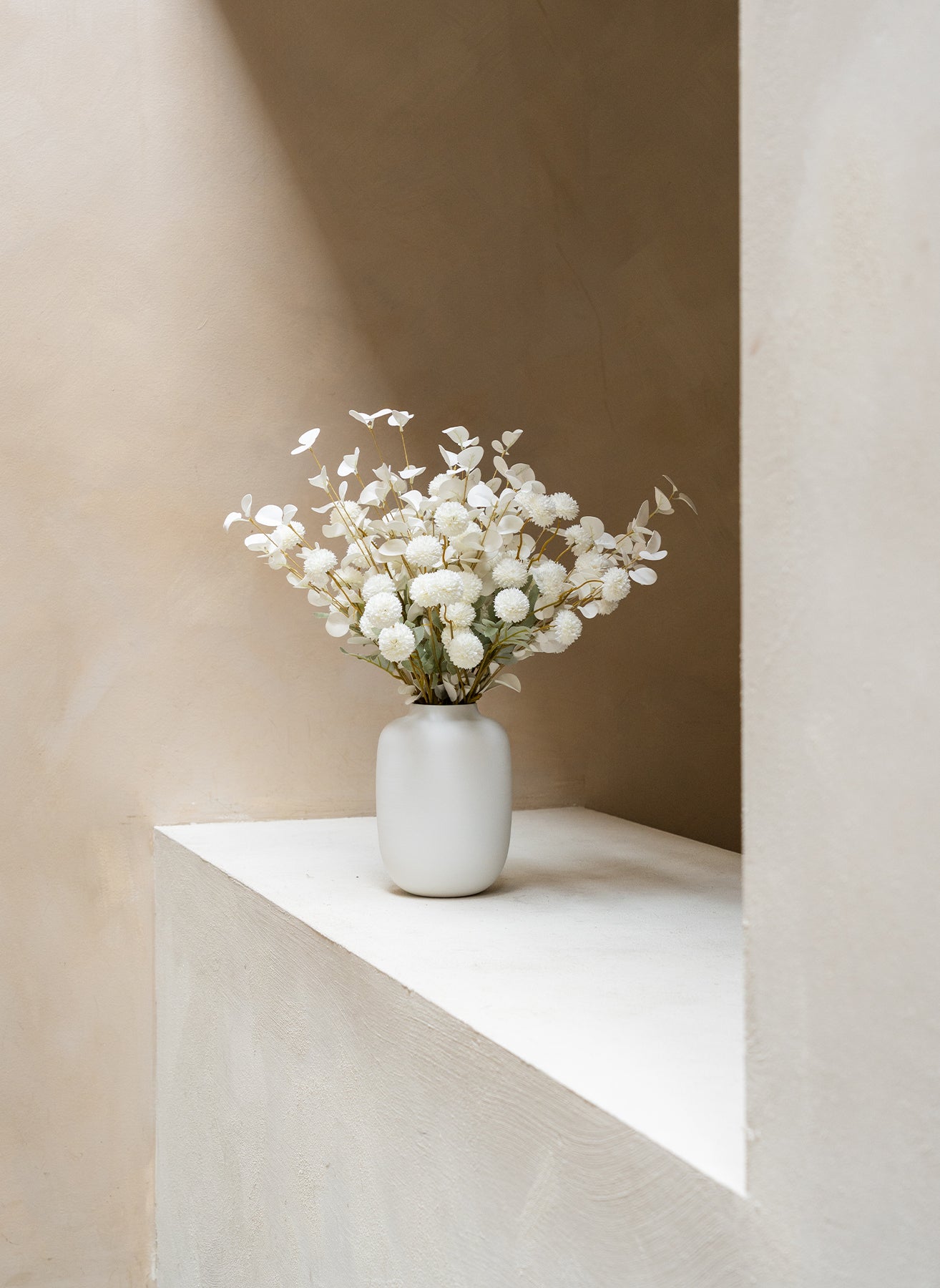 De combinatie van onze Kiku bloemen en Eucalyptus zorgt voor een elegant, natuurlijk geheel met een verfijnde balans.
