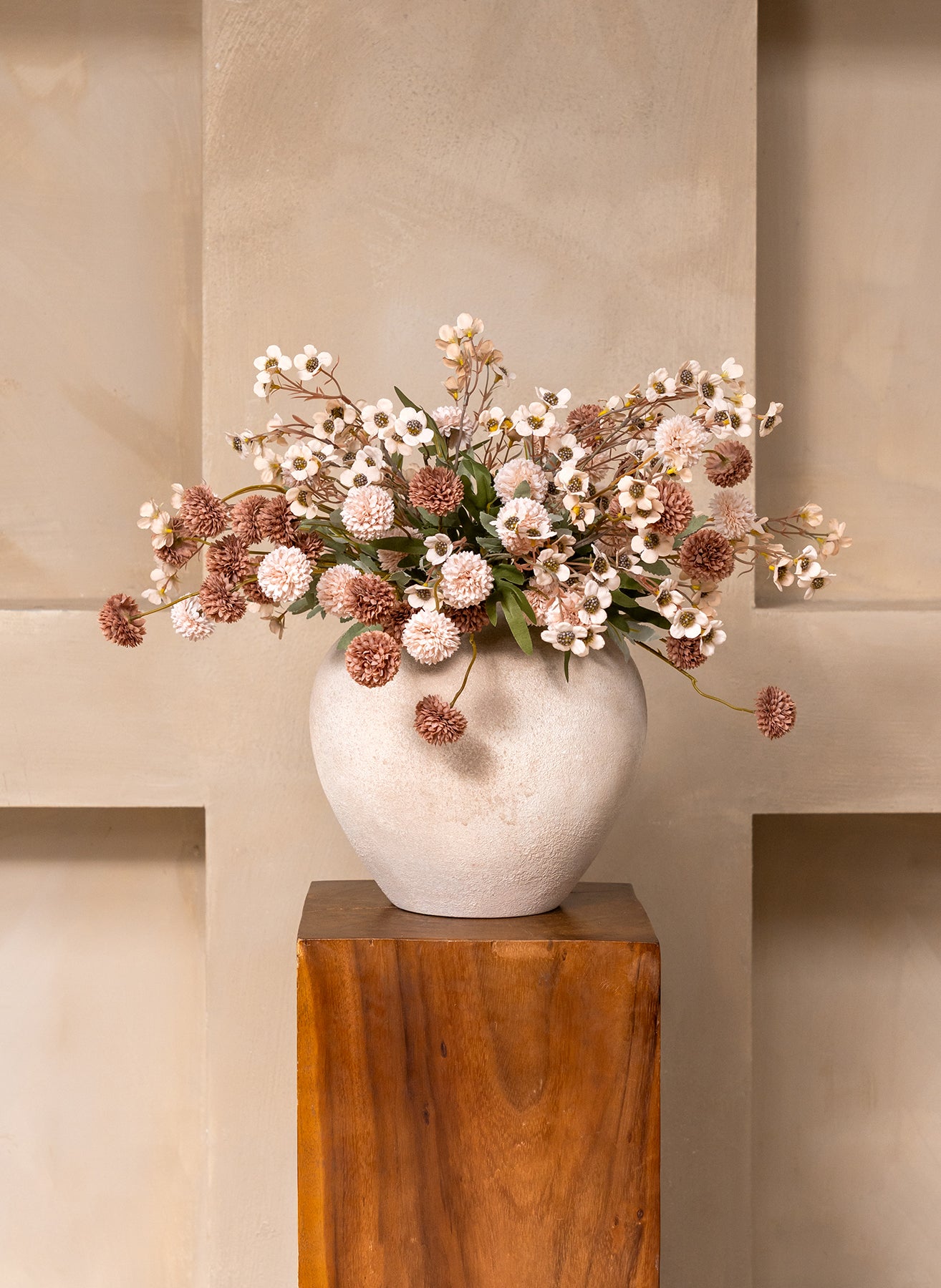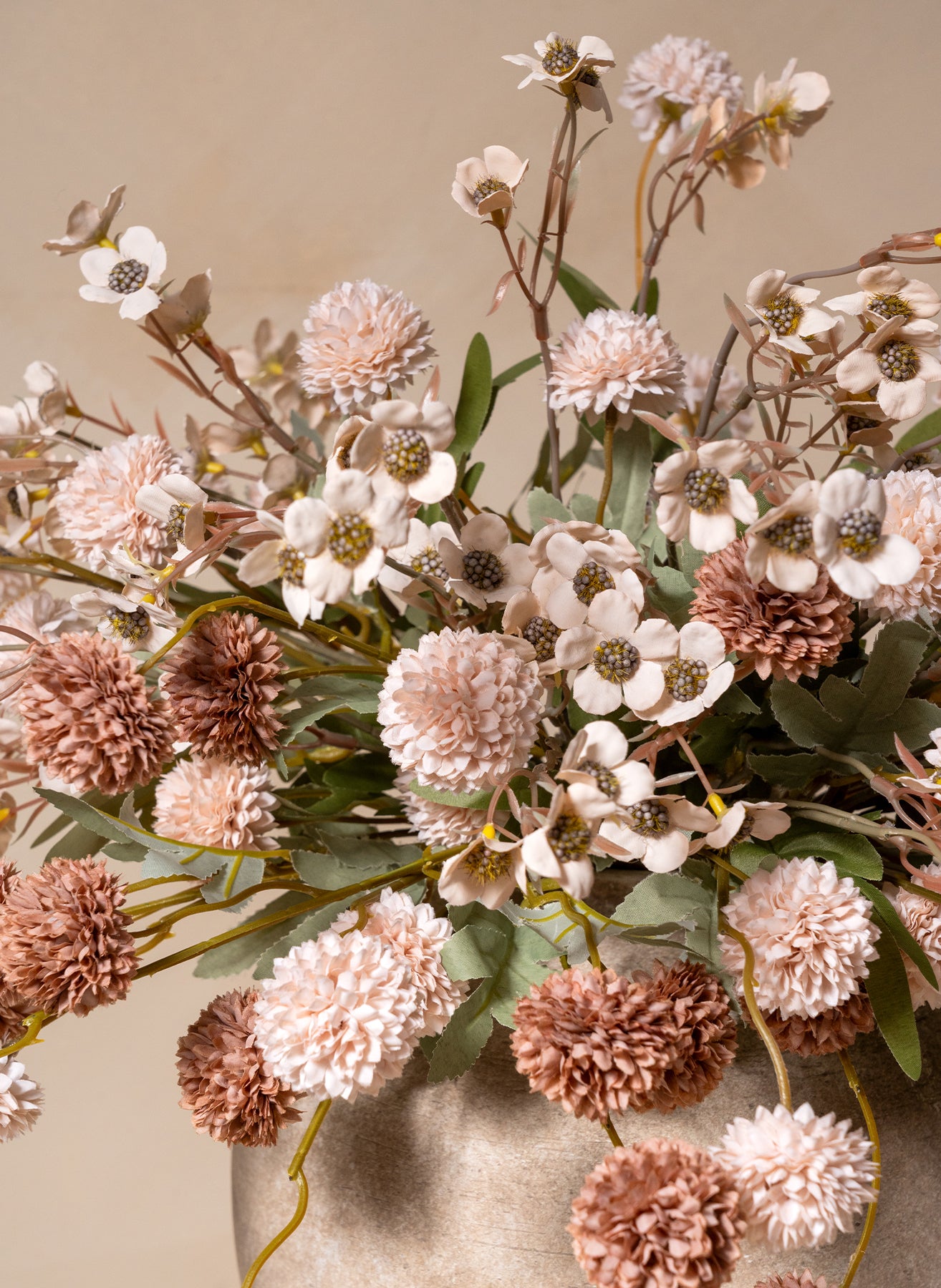 De combinatie van 10 stelen zijden wax bloemen en 10 stelen kiku bloemen zorgt voor een harmonieus geheel met volume, kleur en een natuurlijke uitstraling.