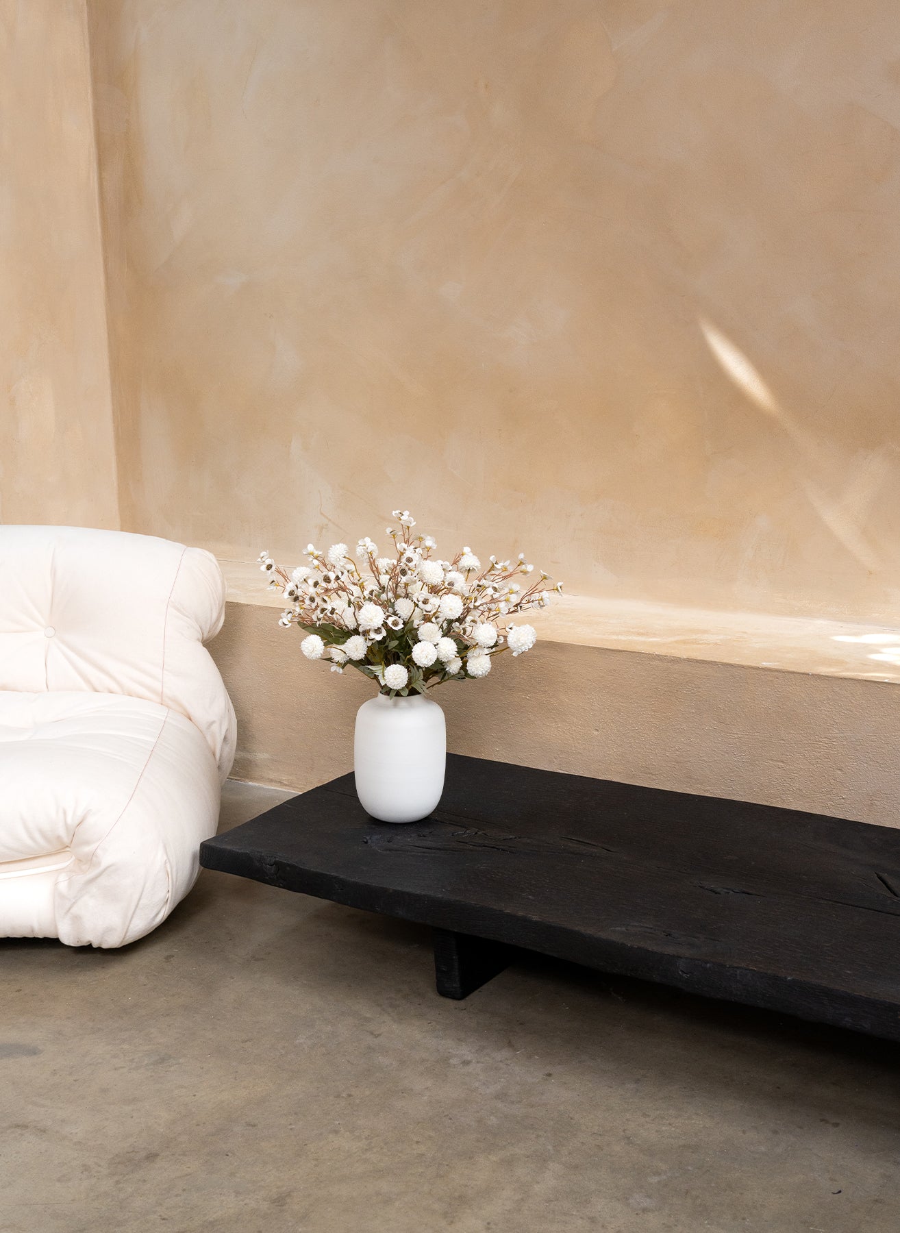 De subtiele bloemen, gecombineerd met luchtige takken, zorgen voor een natuurlijke compositie die moeiteloos opgaat in elke ruimte.