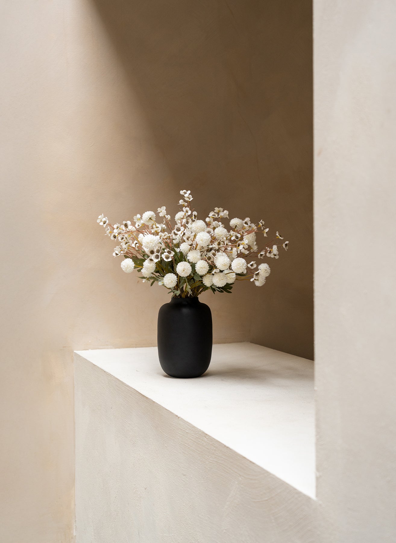 De combinatie van 10 stelen zijden wax bloemen en 10 stelen kiku bloemen zorgt voor een harmonieus geheel met volume, kleur en een natuurlijke uitstraling.