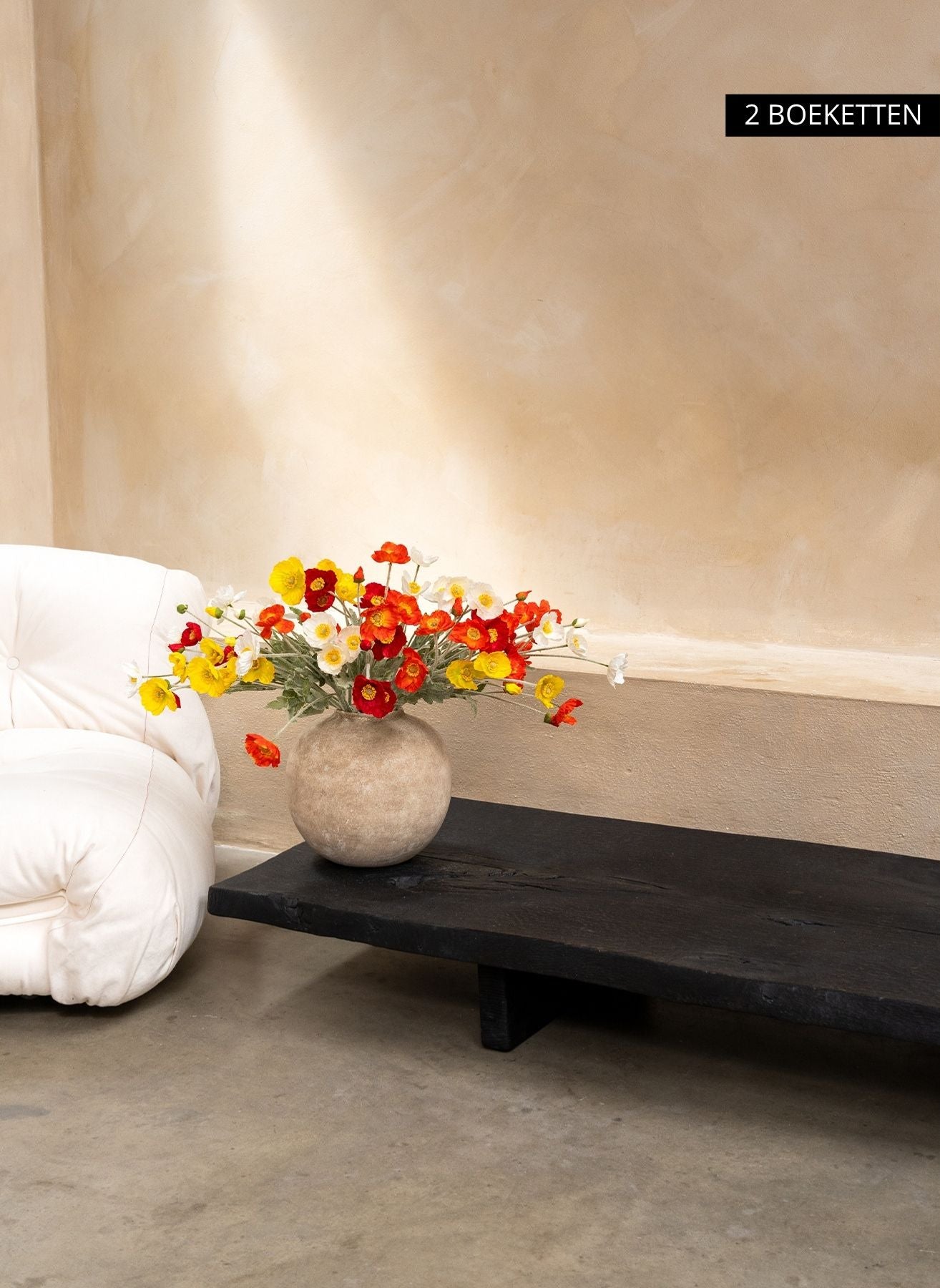 De fijne stelen en open bloemvormen zorgen voor een luchtig geheel dat elegant contrasteert met rustige, natuurlijke materialen.